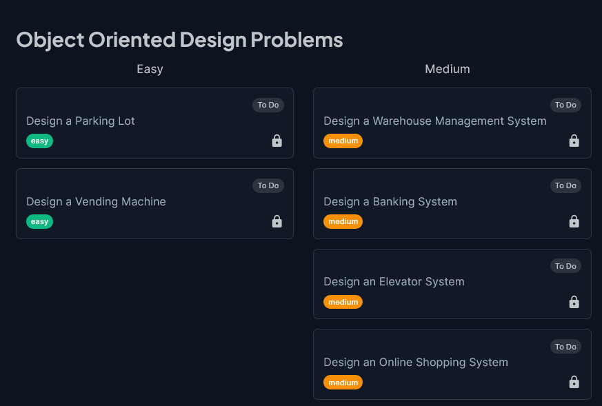 It not only has a set of carefully handpicked case studies, like Parking Lot Problem, which have been repeatedly asked at the top tech companies, but also provides a thorough experience to handle different object-oriented design scenarios.